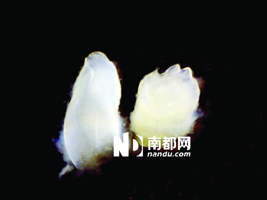 左边是重组再生的牙(放大2 0倍效果),右边是用来对照的小鼠牙齿,都是移植3周后从肾脏包膜下取出的。(蔡景蕾供图)