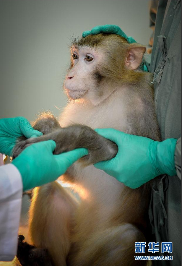 在中科院广州生物医药与健康研究院灵长类动物实验基地,科研人员正在检查一只编号为031137的实验猴的生理指标。