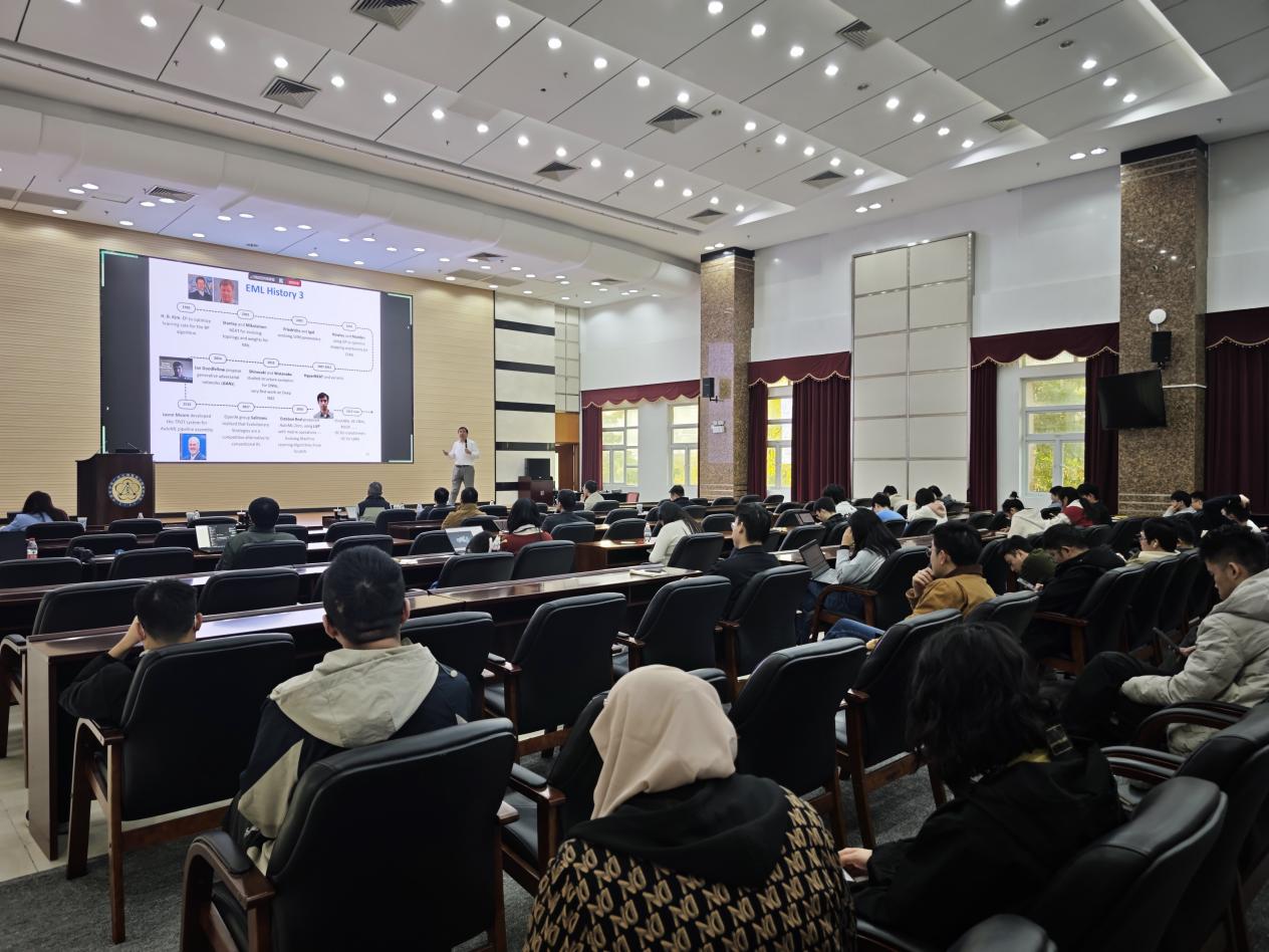 张院士以《Evolutionary Machine Learning: 70 Years of Progress》为题做报告,他以时间为主线,系统梳理了进化机器学习从1950年代图灵提出模式识别理念至今70年的发展脉络,清晰呈现了从规则逻辑、树基模型到神经网络融合的三大关键阶段,详解了GP(基因编程)系列模型迭代及进化计算与深度学习的融合突破。张院士结合团队研究成果,重点介绍了人工智能技术在计算机视觉、医疗微小病灶检测、新冠医疗资源调度、华为供应链优化等领域的跨界应用,同时客观分析了当前理论深度不足、计算量较大、泛化能力待提升等挑战。他强调,未来技术发展应聚焦“真实世界影响”,以解决实际问题为导向,在经济效益、环境效益与人类健康领域实现更大贡献。