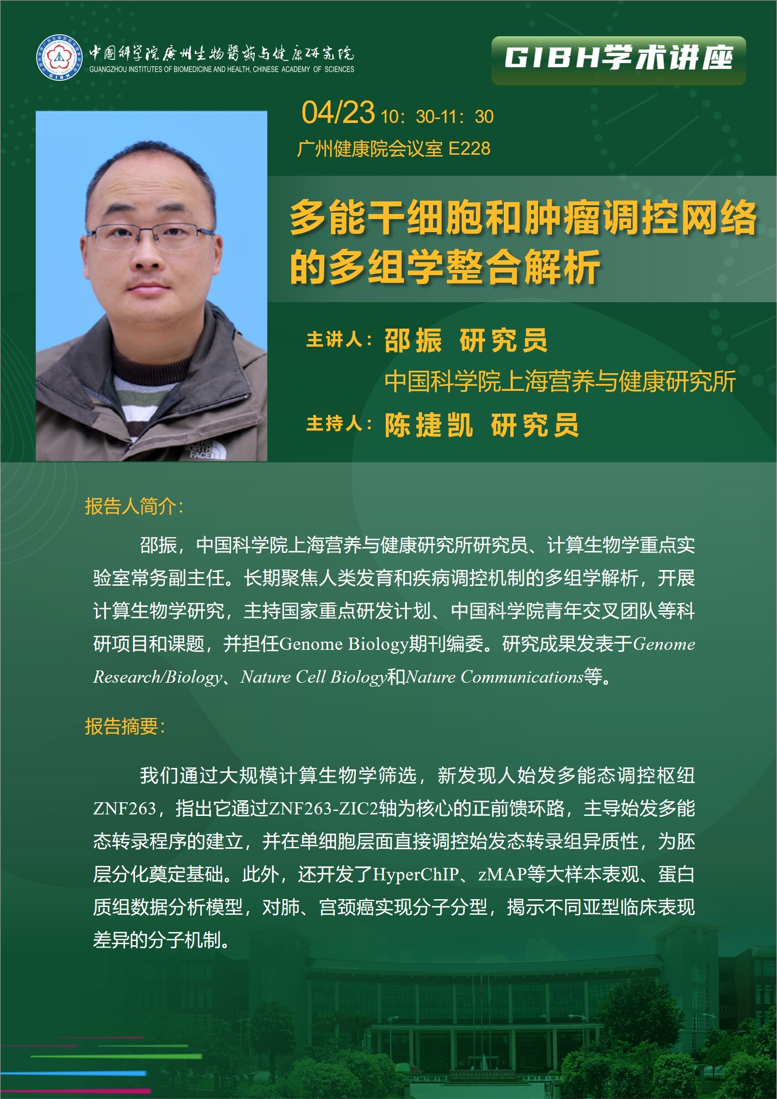 2026年4月23日学术讲座:多能干细胞和肿瘤调控网络的多组学整合解析