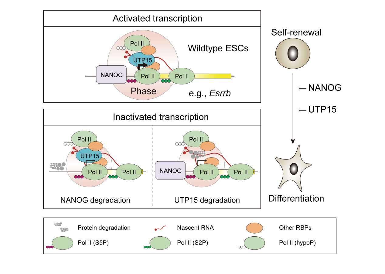该研究通过应用5-乙炔基尿苷(EU)代谢标记与点击化学反应技术,系统绘制了小鼠胚胎干细胞(mESC)中NANOG蛋白快速降解条件下新生转录本及其互作RBP的动态变化图谱。我们发现经典rRNA生物合成调控因子UTP15具有独立于rRNA生物合成的全新功能——作为多能性相关基因转录的关键激活因子。值得注意的是,NANOG调控的转录过程可增强UTP15在转录起始位点(TSS)的结合,该现象与RNA聚合酶II结合增加及更活跃的转录状态密切相关。进一步机制研究表明,UTP15能够促进RNA聚合酶II生物分子凝聚体的组装,从而可能驱动多能性基因的转录激活。本研究首次揭示了NANOG-新生转录本-UTP15这一调控轴在激活多能性基因转录中的核心作用,为研究细胞命运决定过程中主转录因子的功能提供了新的思路。