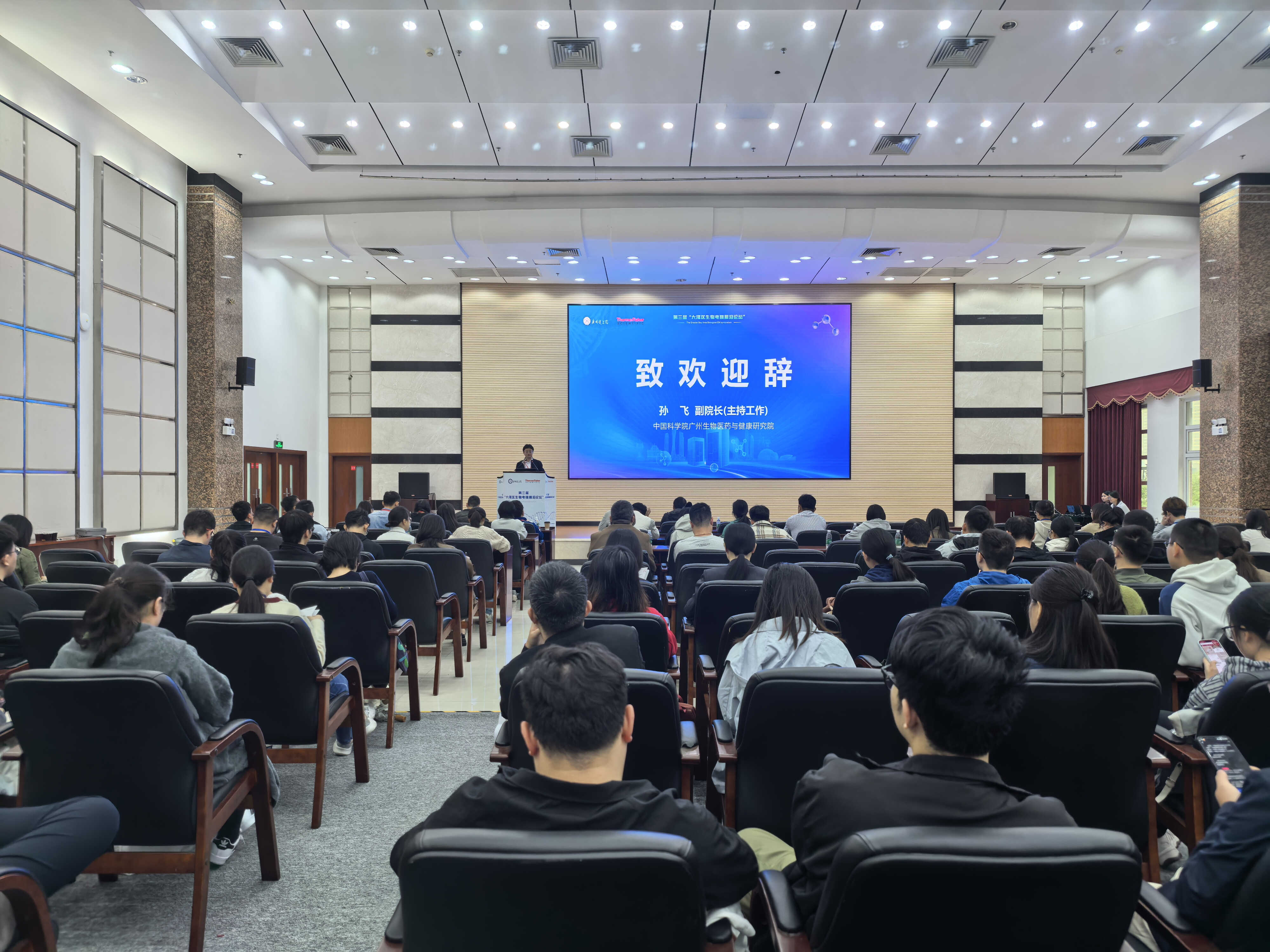 12月13日,由中国科学院广州生物医药与健康研究院数字生物医学研究中心主办的第三届“大湾区生物电镜前沿论坛”在广州健康院开幕。本届论坛聚焦技术革新与科学问题深度融合,吸引了来自香港大学、香港科技大学、深圳医学科学院、南方科技大学及中国科学院南海海洋研究所等粤港澳大湾区高校与科研机构的百余位专家学者及青年研究人员参会。论坛荣誉主席、中国科学院广州生物医药与健康研究院孙飞副院长(主持工作)致欢迎辞,执行主席何俊研究员主持开幕式。