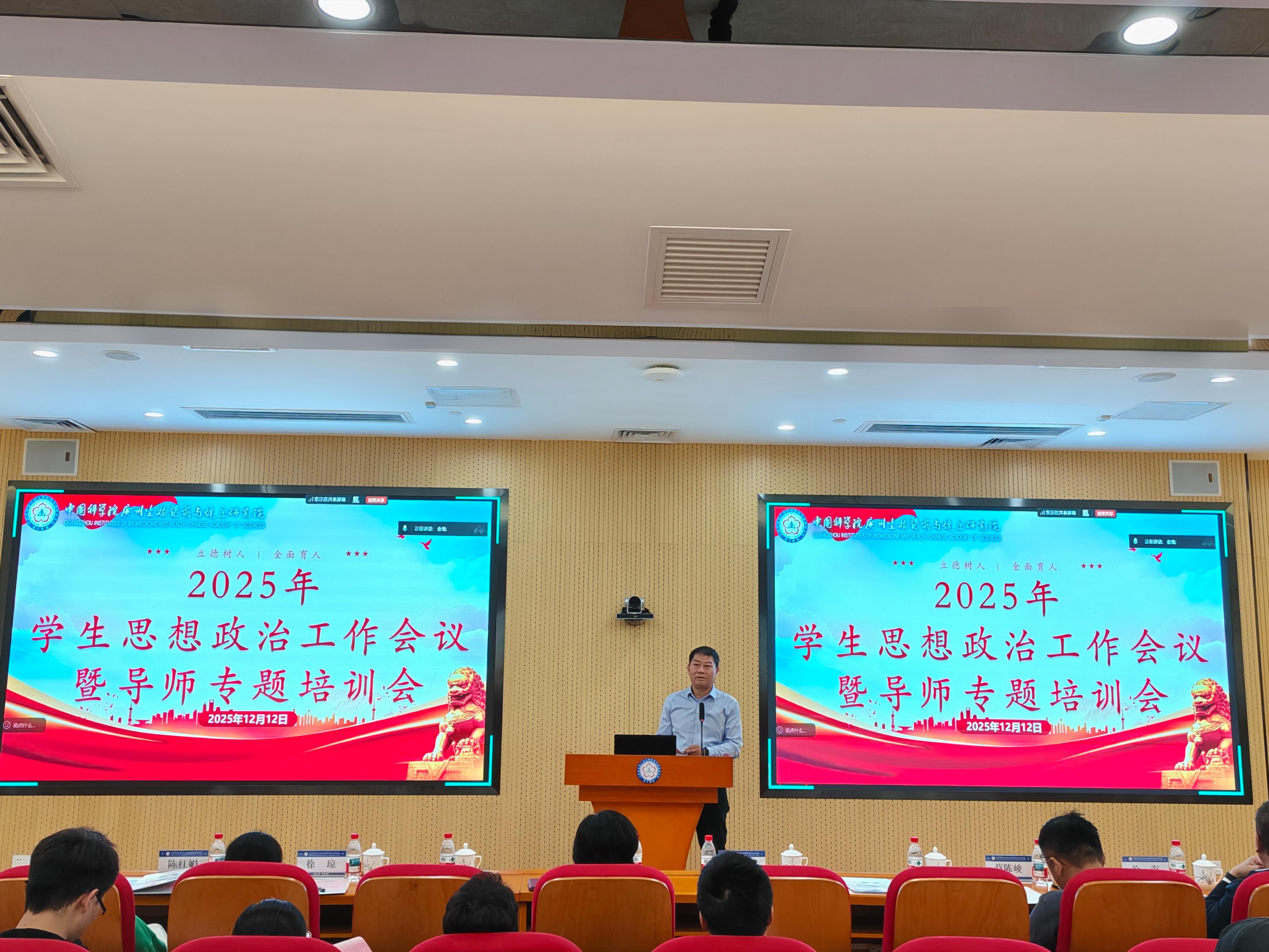 为深入学习贯彻习近平新时代中国特色社会主义思想和党的二十大及历次全会精神,落实《中国共产党思想政治工作条例》及中国科学院关于加强学生思想政治工作相关部署,强化学生思政工作建设,12月12日,广州健康院召开2025年学生思想政治工作会议暨研究生导师培训会。会议聚焦新时代人才培养使命,系统总结年度思政工作,部署重点任务,凝聚培养“有理想、敢担当、能吃苦、肯奋斗”的高水平科技人才共识。