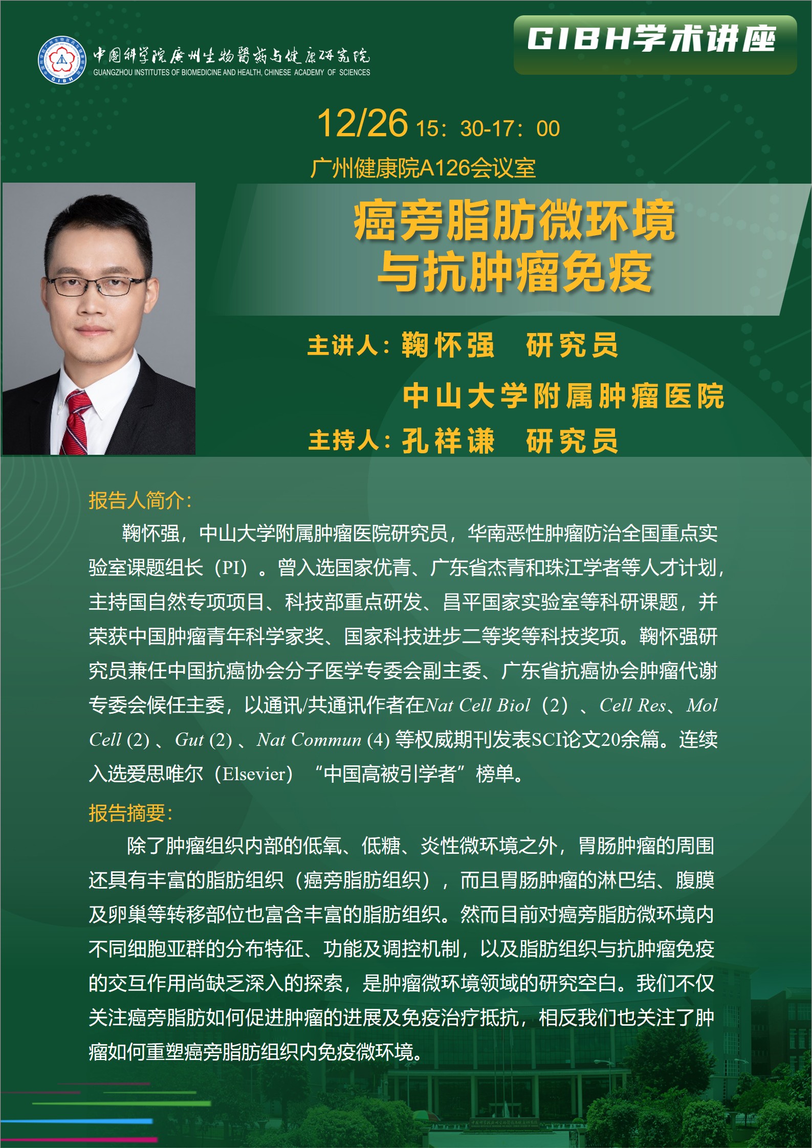 2025年12月26日学术讲座:癌旁脂肪微环境与抗肿瘤免疫