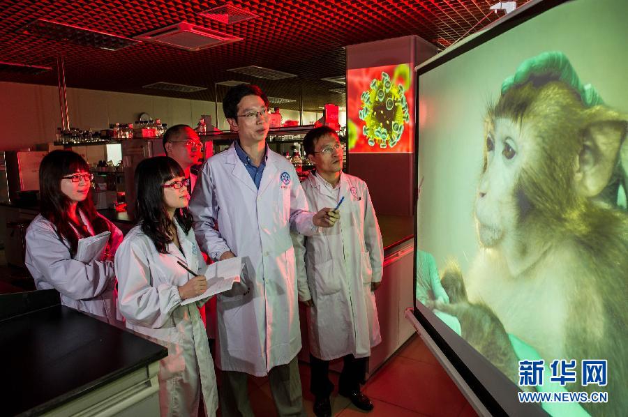 中科院广州生物医药与健康研究院陈凌博士(右二)和他的团队在实验室分析参加攻毒试验的031137号实验猴的结果。