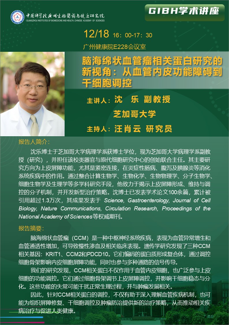 2025年12月18日学术讲座:脑海绵状血管瘤相关蛋白研究的新视角:从血管内皮功能障碍到干细胞调控